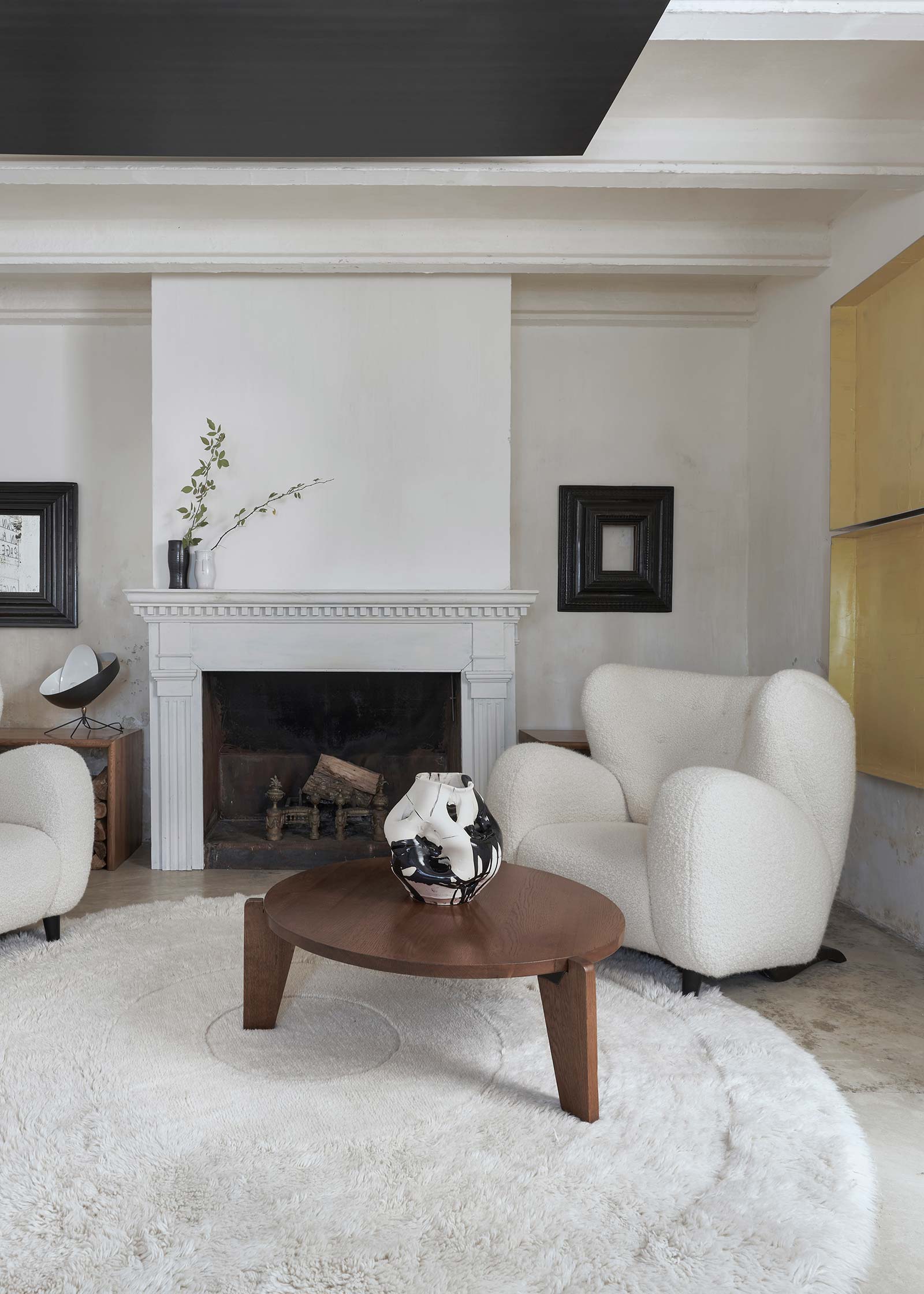 Het Arctic Circle vloerkleed van Lorena Canals is een ruim bemeten rond vloerkleed met een korte pool, omgeven door rijen van steeds langere polen, eindigend met een pluizige lange pool aan de randen.