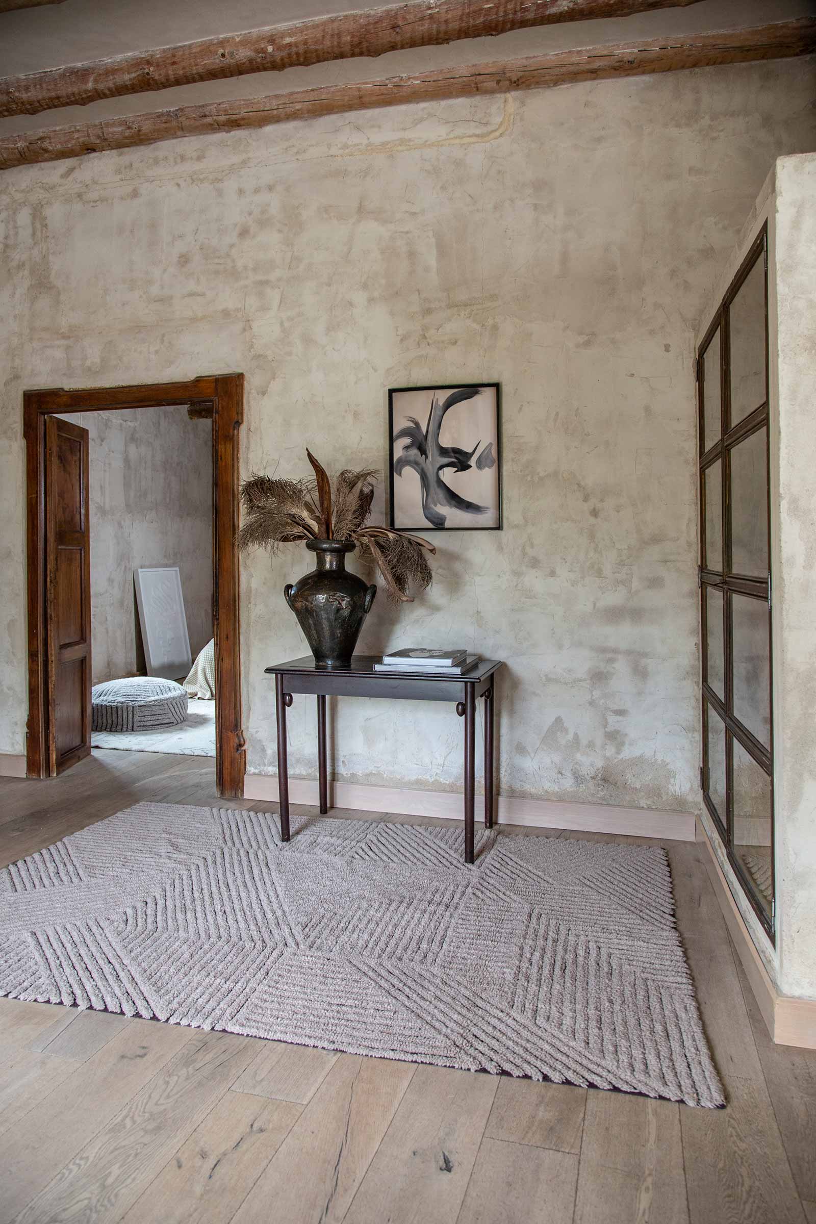 Geïnspireerd door een landschap van gecultiveerde velden, is dit rechthoekige wollen vloerkleed van Lorena Canals uitgewerkt met behulp van het contrast van de katoenen canvas basis in Charcoal kleur, zichtbaar tussen de kortpolige wol in Silver Gray kleur.