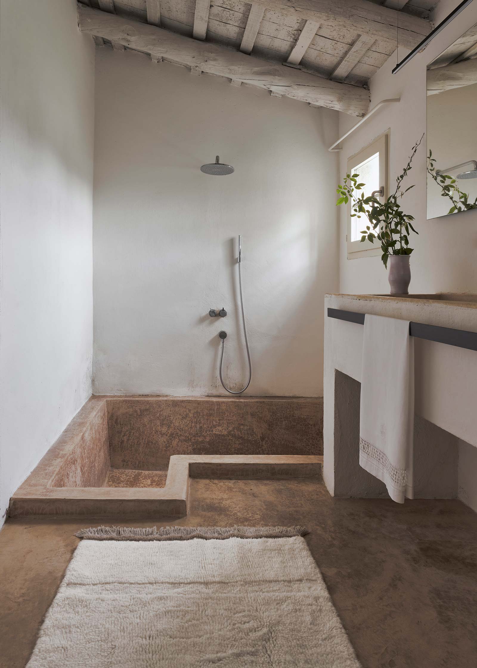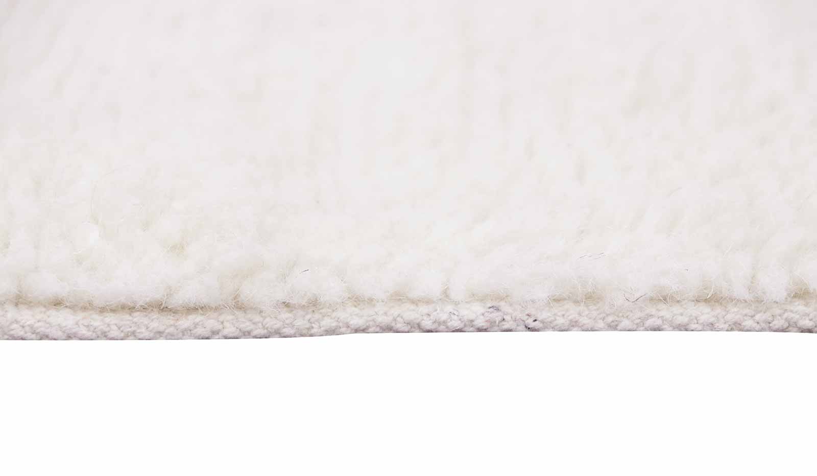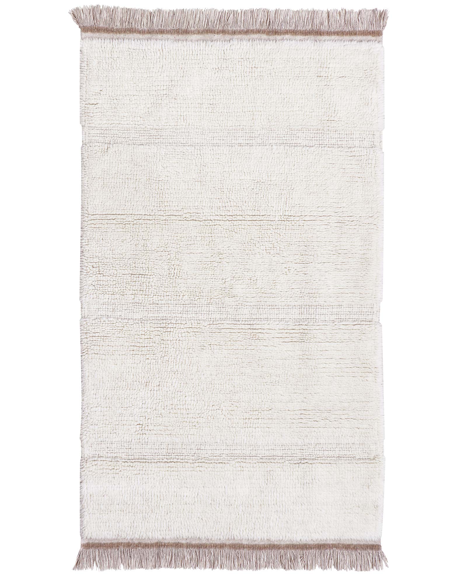 Rechthoekig vloerkleed van Lorena Canals dat een zachte korte wolpool combineert met horizontale rijen extra korte pool, waardoor een subtiel patroon ontstaat. Aan de randen afgewerkt met een contrasterende kleurlijn en korte franjes die uit de basis komen.